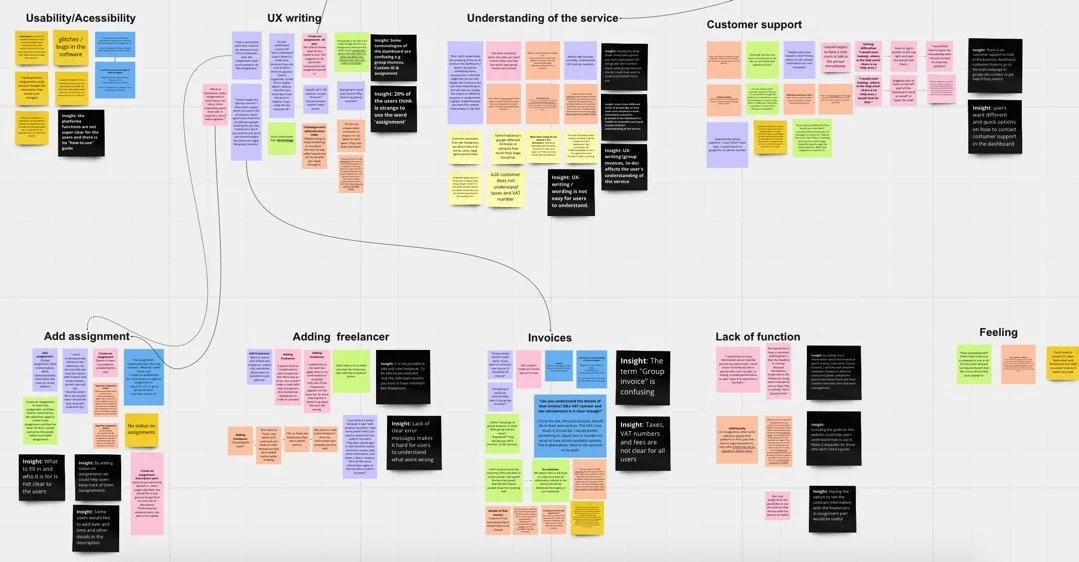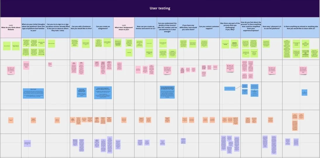 As our goal was to gain information and deeply understand users’ pain points, we conducted interviews with Cool Company’s customer support team as well as the head of B2B team & IT. We also conducted five interviews and user tests with people from diverse backgrounds who have their own companies and who have experience or are willing to hire freelancers. It was super valuable for us to observe how they interact with the platform and to hear about their thoughts and feelings while using it.