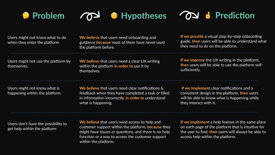 From these insights we created our hypothesis and How Might We related to our main research findings: Lack of onboarding for new users, unclear UX writing, lack of clear notifications or feedback in the platform, and no help function or customer support within the platform.